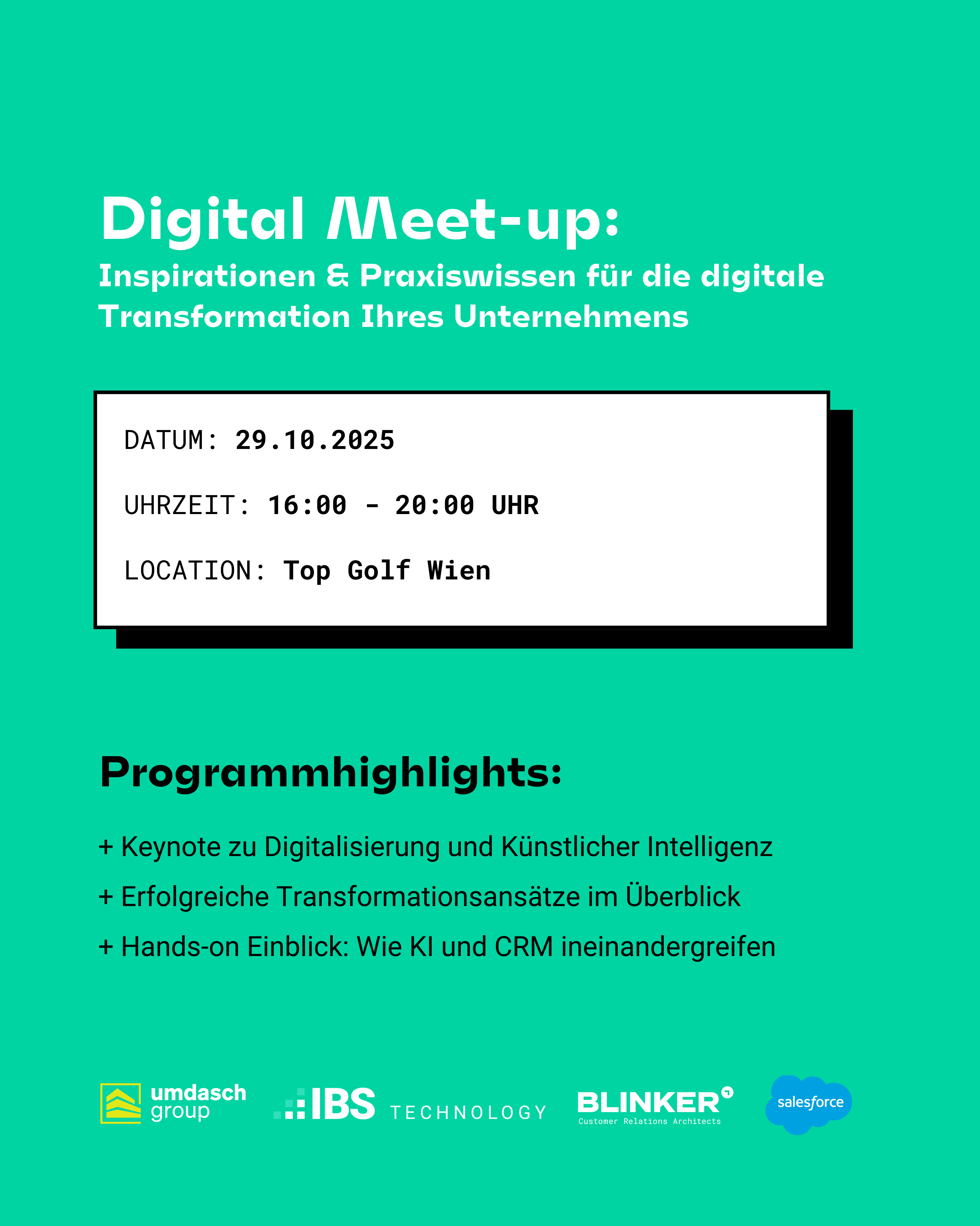 Entdecken Sie, wie moderne Technologien Ihr Unternehmen transformieren können – von effizientem Kundenservice bis zu smartem Vertrieb mit KI-Unterstützung. Gemeinsam mit Expert:innen von Umdasch Group, IBS Technology, Salesforce und BLINKER zeigen wir anhand konkreter Beispiele, wie Digitalisierung nicht nur möglich, sondern messbar erfolgreich wird.